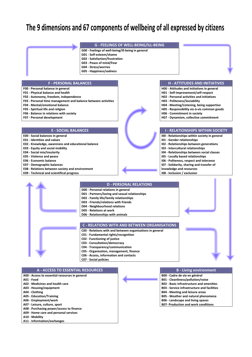 The first result of SPIRAL is the multidimensionality of the well-being for all, when defined by citizens. SPIRAL sessions done since 2006 and the actual database of more than 60 criteria have lead to define 9 dimensions and 67 components.