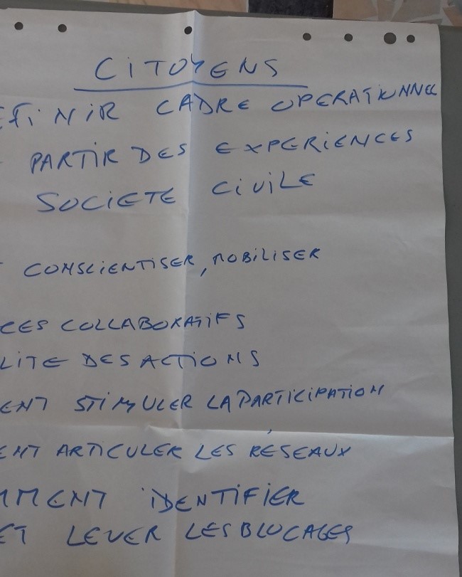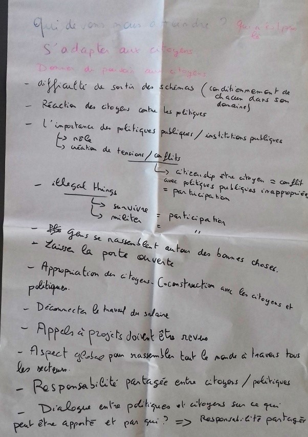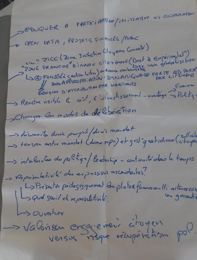 - Il est important de voir qui n’est pas là, d'observer les absents et de réfléchir à comment faire pour les atteindre. - Il faut s’adapter au citoyen à qui l'on s’adresse - Il est nécessaire de donner plus de pouvoir au citoyen - On observe une difficulté à sortir des schémas : avoir des assemblées citoyennes, rassembler les secteurs, dépasser les intérêts individuels. - Participation : elle comprend toutes les initiatives, même illégales, et même les mouvements, rassemblements etc. - Il faut toujours laisser la porte ouverte à tous. - Les appels à projets ne sont plus adaptés : trop restrictifs, ils doivent être revus. - Il faut plus de dialogue entre tous les acteurs des territoires - Problème du système : les décisionnaires ont trop de pouvoir. DONC ils sont jugés, et c’est « injuste ».