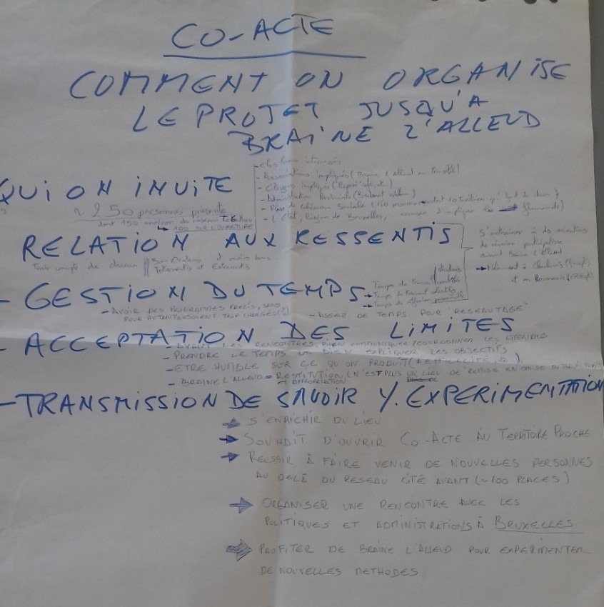 • Transmission de savoir et expérimentation : S’enrichir du lieu. Ouvrir CO-ACTE aux territoires proches. Organiser une rencontre avec les politiciens à Bruxelles. Chercher à faire un travail d’expérimentation sur ces méthodes de réunion et la mise en pratique immédiate.