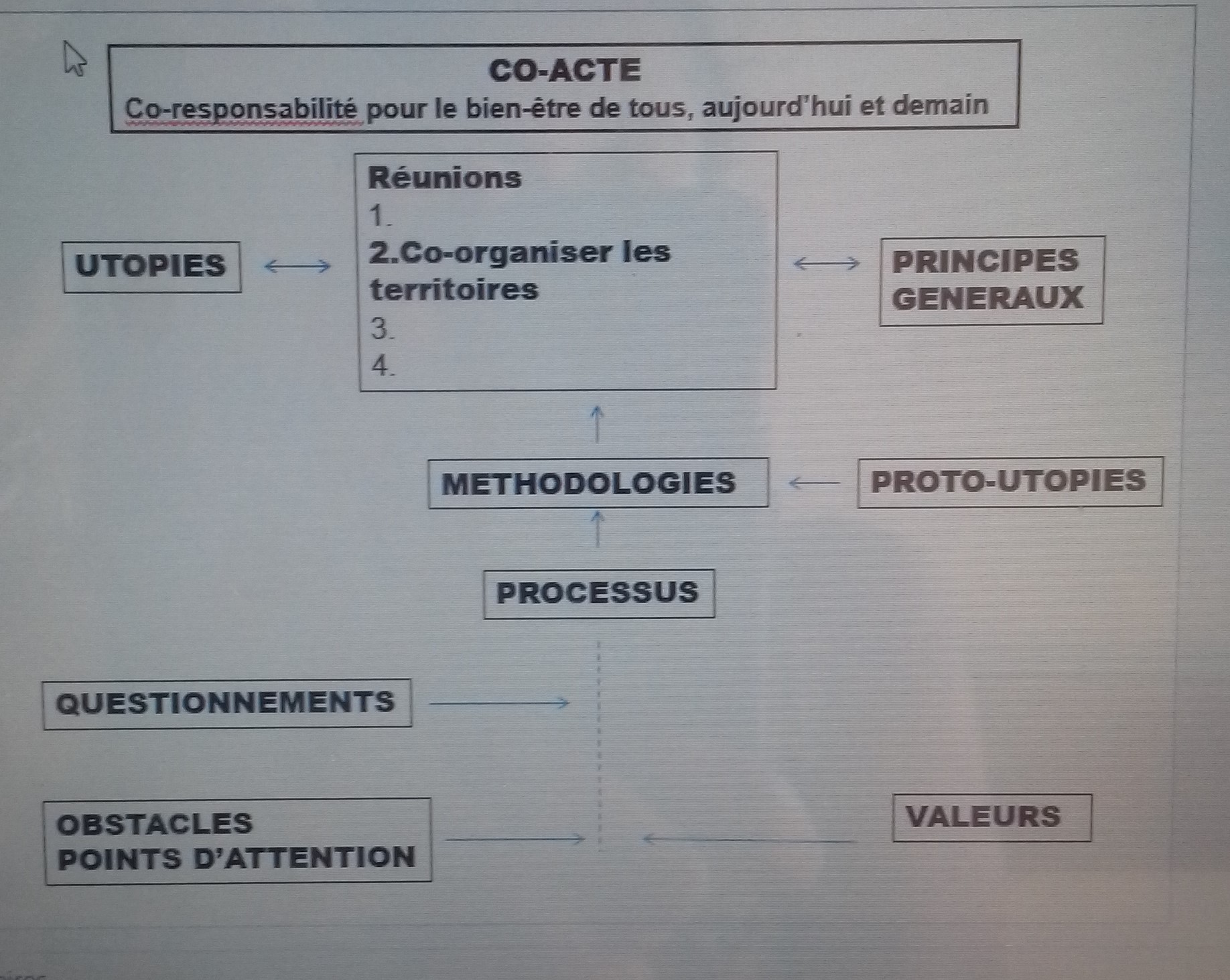 Cette seconde réunion des réseaux thématiques a pour but de définir des mesures de co-organisation du territoire pour le bien-être de tous. Elle s’ancre dans une succession de 4 réunions de réseaux thématiques pour mener à une ultime réunion à Braine l’Alleud (Belgique). Il s’agira de s’appuyer sur la synthèse déjà établie (Cf Graphique synthétique ci-dessous) afin de donner des propositions de politiques publiques. Cette synthèse est une approche systémique qui représente toujours 3 niveaux : au niveau individuel, par rapport à l’environnement proche et enfin par rapport à la société à un niveau plus global. Le but est de mettre en avant le concept de proto-utopies : des étapes intermédiaires afin d’arriver à l’utopie. Lors d’une rencontre avec Reflect’action, la question du processus de changement a émergé, amenant à se demander : Comment participe-t-on au changement ? Il s’agit donc d’établir un lien entre la société complexe et un processus simple de changement. La comparaison avec la cuisine est alors proposée. Avant toutes choses, l’on a besoin d’un combustible qui créer de la chaleur, elle-même à l’origine de la transformation des aliments. De plus, la cuisine est réglementée par un ensemble de règles, acteurs, organisations et processus, tout comme la société. Le schéma est donc une représentation de cette idée. En bas du schéma, on aurait les rêves et utopies avec une influence du local sur le global. La manière dont on change individuellement peut avoir une influence sur le changement global. Ensuite, il y a donc le processus de changement. Il faut échanger, penser ensemble, co-définir, co-évaluer pour permettre progressivement un changement. Emerge alors cette question des proto-utopies : c’est ce que l’on arrive à mettre en place à partir des grandes utopies. Aujourd’hui nous sommes dans une culture hiérarchique descendante, le chef choisi, donne ses idées et les autres suivent. Il faut changer ce genre de processus individuel pour passer à un processus de collaboration de groupe. Pour mettre en place un tel changement, il est important de travailler à différents niveaux et de modifier l’organisation de la société. Nous devons libérer du temps pour nous, créer des espaces pour permettre aux gens de se réaliser. En permettant aux gens d’aller mieux, c’est la société toute entière qui ira mieux. La problématique de la réunion sera donc la suivante : Quelles politiques publiques devons-nous mettre en place pour créer des proto-utopies, qui peuvent nous rapprocher de l’utopie recherchée, à savoir un modèle d’organisation concertée et coresponsable de l'espace, assurant au mieux le bien-être de tous, y compris celui des générations futures ? La synthèse n’est pas un résultat en soi mais un mode de fonctionnement. Ce n’est pas un endroit où aller, mais plutôt un support sur lequel s’appuyer pour effectuer le changement.